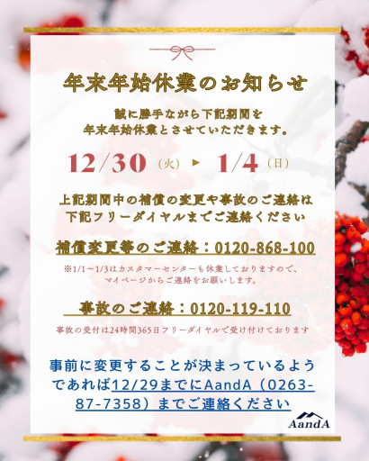 現在分かっている補償の変更などございましたら、12/29(月)17時までにAandAへご連絡ください。